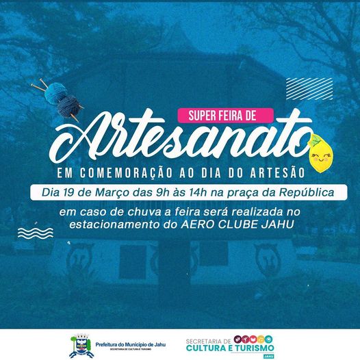 No dia 19 de março, comemora-se o Dia do Artesão. A Secretaria de Cultura e Turismo estará promovendo a “Super Feira de Artesanato “.