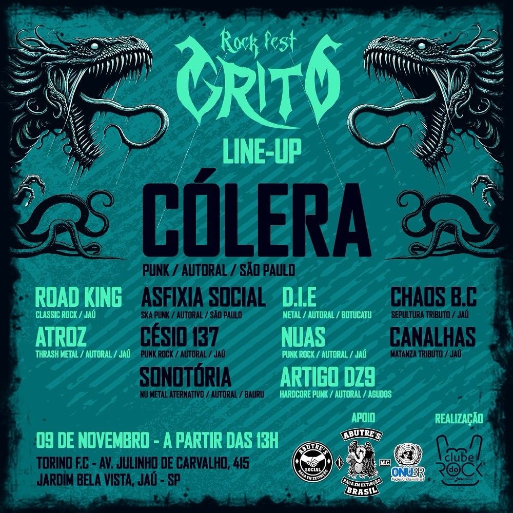 Acompanhe abaixo o line-up que tem bandas da região e a clássica banda de punk rock nacional - Colera!