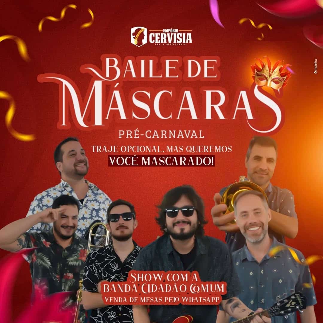 Banda Cidadão Comum se apresentará no Baile de Máscaras no Empório Cervisia, neste sábado, dia 22 de fevereiro a partir das 20 horas.