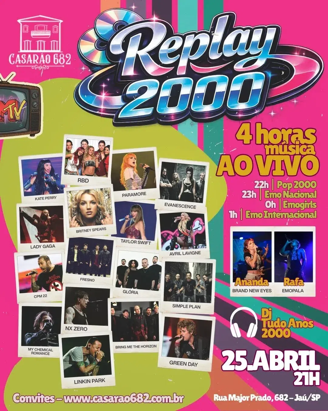 No dia 25 de Abril serão 4 horas de música AO VIVO dedicadas a geração emo e pop nostálgico, divididas em 4 blocos!